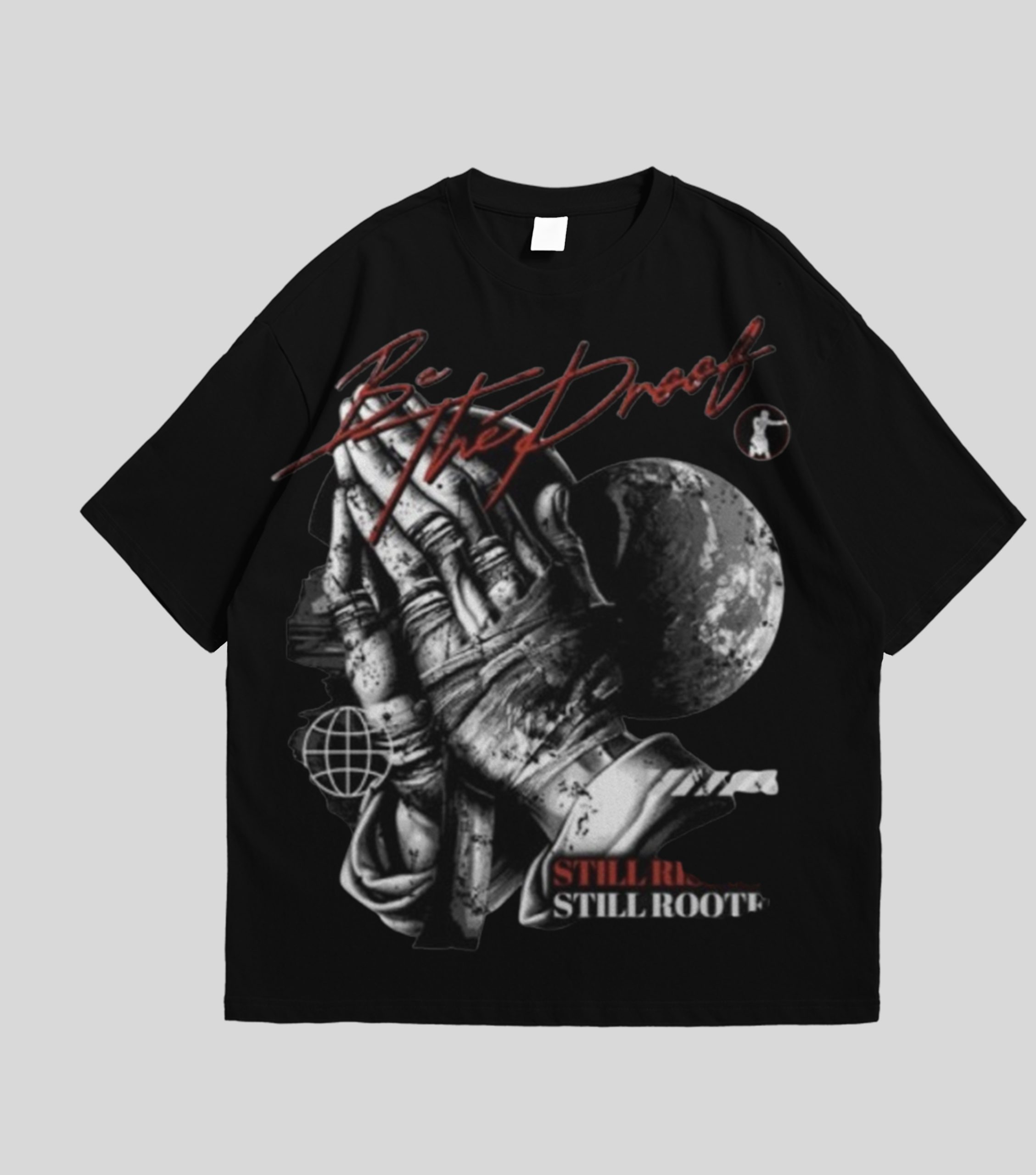 The Healing Hands Tee blends spiritual energy with urban grit. Designed with weathered praying hands, a global graphic, and lunar backdrop symbolizing being still real, still rooted. Premium soft cotton with oversized fit for everyday wear.