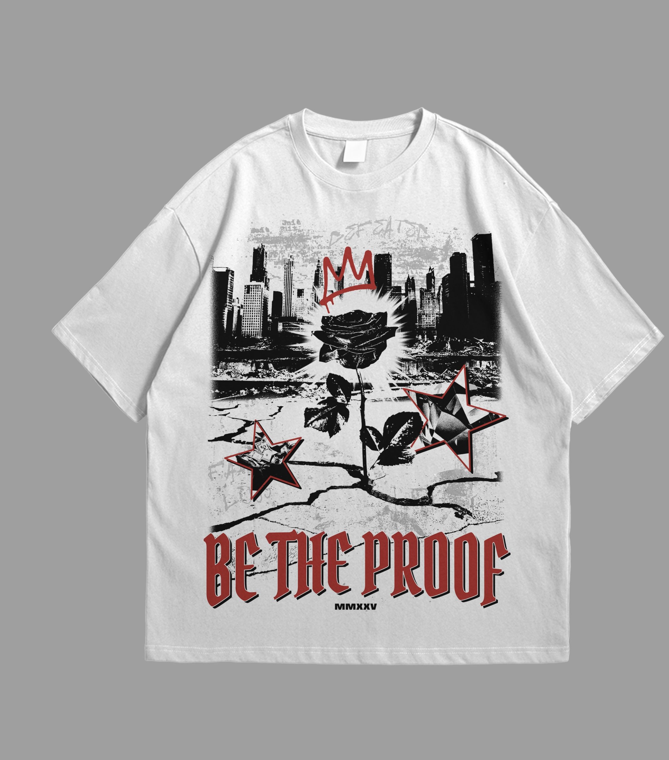 The Rose Land Tee symbolizes growth and power born from struggle. Featuring a cracked cityscape backdrop with a crowned rose breaking through concrete. Lightweight cotton, oversized fit, designed for both statement and comfort.
