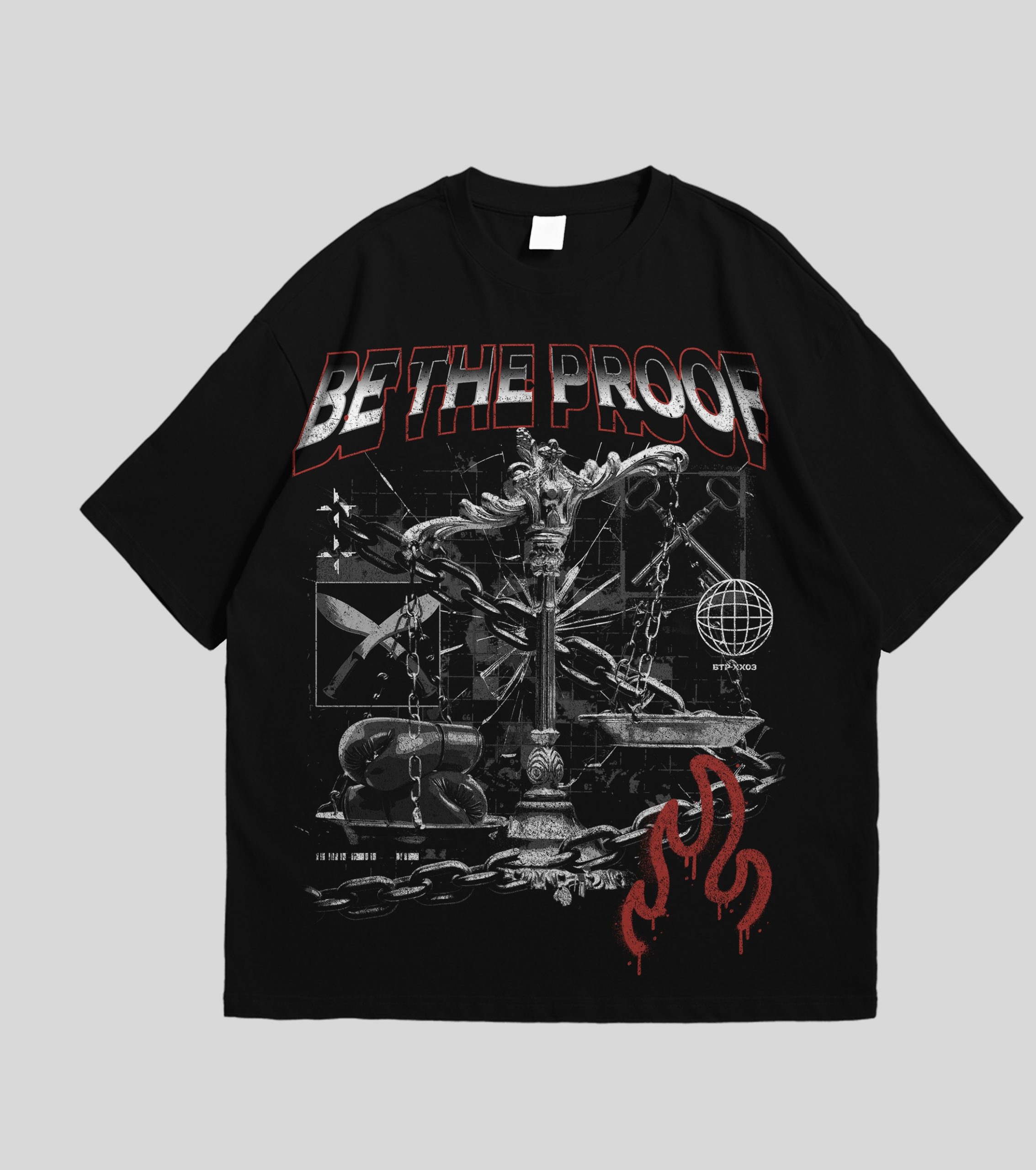 The Weighted Tee represents resilience under pressure. Featuring the bold Be The Proof logo over a cracked justice scale wrapped in chains, accented by red flame detail. Heavyweight cotton blend for durability and comfort. Perfect for those who carry weight and still rise.